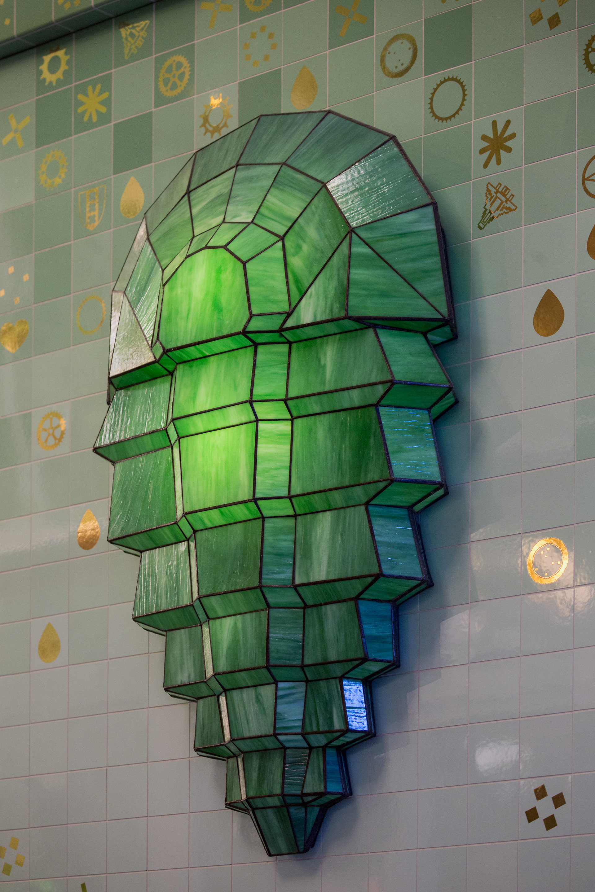 Hand glazed gold luster tiles, artist Iris Roskam, made by Maatwerk tegels, glued by Zulliani.